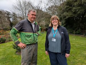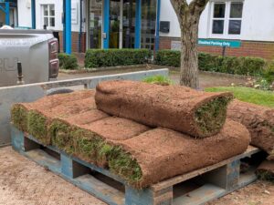 The plan was to lay the turf in November, but Storm Claudia brought heavy rain and high winds across the South West, making the work impossible. Despite lots of calls and emails to try and sort out a new time, in the end major building works started at Searle House meant the site was inaccessible. So the returfing was be put on hold.